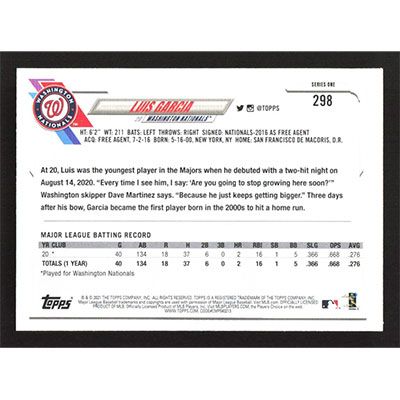 This is a 2021 Topps Luis Garcia baseball card. The card is #298 and pictures show condition.