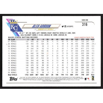 This is a 2021 Topps Alex Gordon baseball card. The card is #316 and pictures show condition.