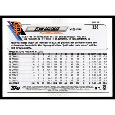 This is a 2021 Topps Kevin Gausman baseball card. The card is #328 and pictures show condition.