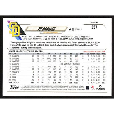 This is a 2021 Topps Yu Darvish baseball card. The card is #357 and pictures show condition.