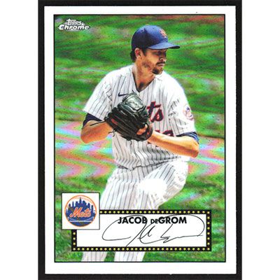 This is a 2021 Topps '52 Redux Chrome Jacob deGrom baseball card. The card is #TC52-15 and pictures show condition.