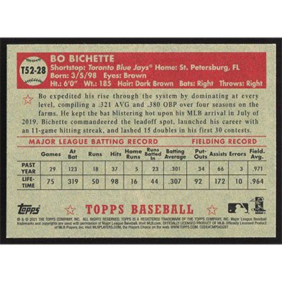 This is a 2021 Topps '52 Redux Bo Bichette baseball card. The card is #T52-28 and pictures show condition.