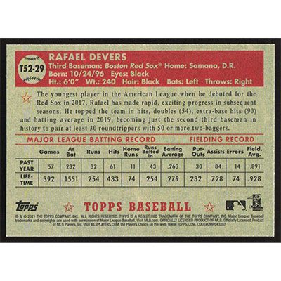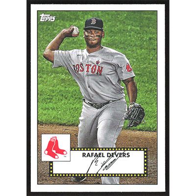 This is a 2021 Topps '52 Redux Rafael Devers baseball card. The card is #T52-29 and pictures show condition.