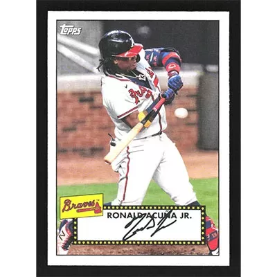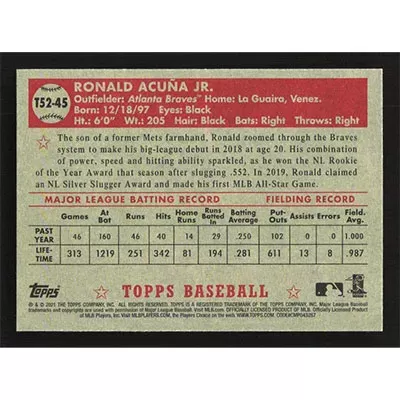 This is a 2021 Topps '52 Redux Ronald Acuña Jr. baseball card. The card is #T52-45 and pictures show condition.