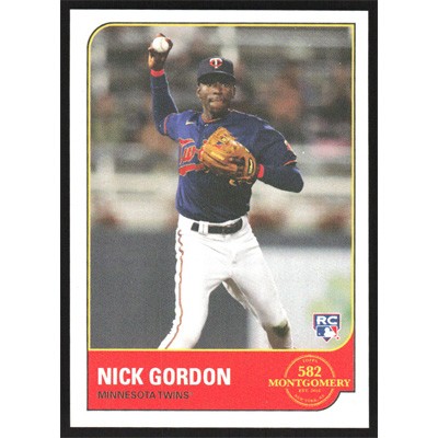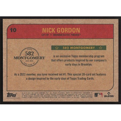This is a 2021 Topps 582 Montgomery Club Lost Design Set 1 Nick Gordon baseball card. The card is #10 and pictures show condition.
