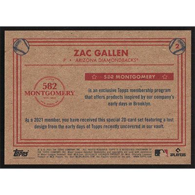 This is a 2021 Topps 582 Montgomery Club Lost Design Set 3 Zac Gallen baseball card. The card is #2 and pictures show condition. Team(s): Arizona Diamondbacks