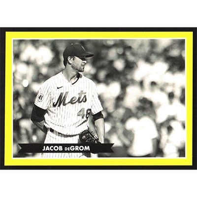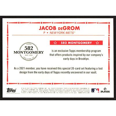 This is a 2021 Topps 582 Montgomery Club Lost Design Stickers Jacob deGrom baseball card. The card is #6 and pictures show condition. Team(s): New York Mets