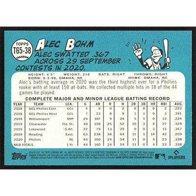 This is a 2021 Topps '65 Redux Alec Bohm baseball card. The card is #T65-38 and pictures show condition. Team(s): Philadelphia Phillies Rookie Card (RC)