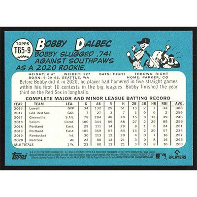 This is a 2021 Topps '65 Redux Bobby Dalbec baseball card. The card is #T65-9 and pictures show condition.