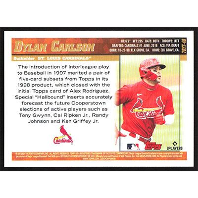 This is a 2021 Topps 70 Years of Topps Baseball Dylan Carlson baseball card. The card is #70YT-48 and pictures show condition. Team(s): St. Louis Cardinals Rookie Card (RC)