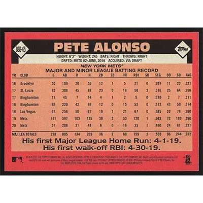 This is a 2021 Topps '86 Pete Alonso baseball card. The card is #86B-65 and pictures show condition.