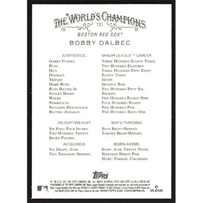 This is a 2021 Topps Allen & Ginter Bobby Dalbec baseball card. The card is #121 and pictures show condition. Team(s): Boston Red Sox Rookie Card (RC)