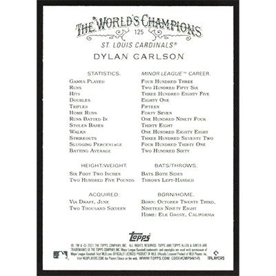 This is a 2021 Topps Allen & Ginter Dylan Carlson baseball card. The card is #125 and pictures show condition. Team(s): St. Louis Cardinals Rookie Card (RC)