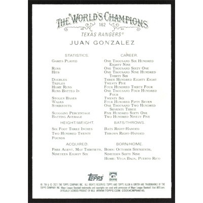This is a 2021 Topps Allen & Ginter Juan Gonzalez baseball card. The card is #162 and pictures show condition.