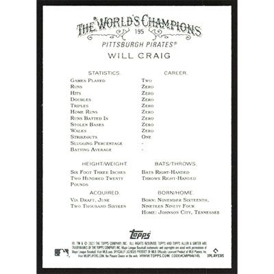 This is a 2021 Topps Allen & Ginter Will Craig baseball card. The card is #195 and pictures show condition. Team(s): Pittsburgh Pirates Rookie Card (RC)