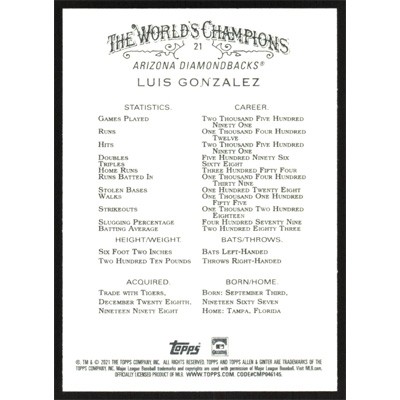 This is a 2021 Topps Allen & Ginter Luis Gonzalez baseball card. The card is #21 and pictures show condition.