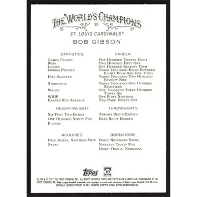 This is a 2021 Topps Allen & Ginter Bob Gibson baseball card. The card is #81 and pictures show condition.