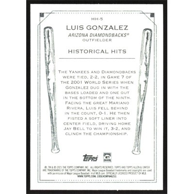 This is a 2021 Topps Allen & Ginter Historical Hits Luis Gonzalez baseball card. The card is #HH-5 and pictures show condition. Team(s): Arizona Diamondbacks