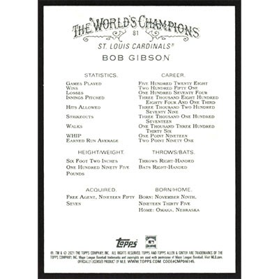 This is a 2021 Topps Allen & Ginter X Bob Gibson baseball card. The card is #81 and pictures show condition.
