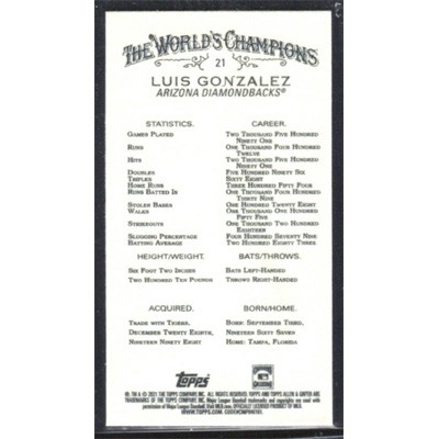 This is a 2021 Topps Allen & Ginter X Mini Luis Gonzalez baseball card. The card is #21 and pictures show condition.