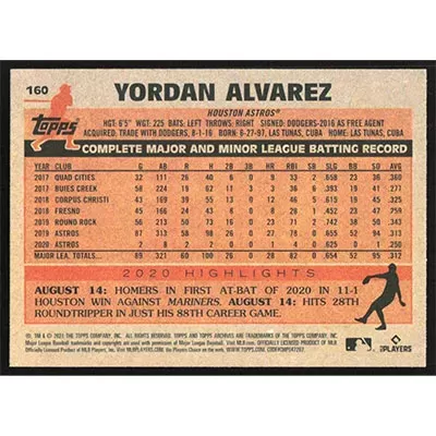 This is a 2021 Topps Archives Yordan Alvarez baseball card. The card is #160 and pictures show condition.