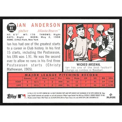This is a 2021 Topps Archives Ian Anderson baseball card. The card is #81 and pictures show condition.