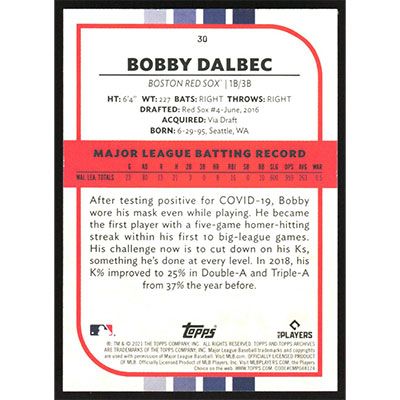 This is a 2021 Topps Archives Snapshots Bobby Dalbec baseball card. The card is #30 and pictures show condition. Team(s): Boston Red Sox Rookie Card (RC)