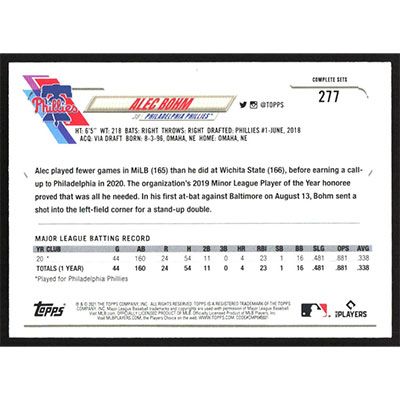 This is a 2021 Topps Base Set Photo Variations Complete Set Alec Bohm baseball card. The card is #277 and pictures show condition. Team(s): Philadelphia Phillies Rookie Card (RC)