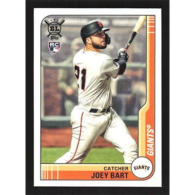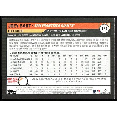 This is a 2021 Topps Big League Joey Bart baseball card. The card is #164 and pictures show condition. Team(s): San Francisco Giants Rookie Card (RC)