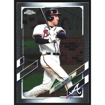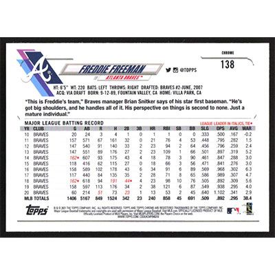 This is a 2021 Topps Chrome Freddie Freeman baseball card. The card is #138 and pictures show condition.