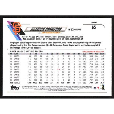 This is a 2021 Topps Chrome Brandon Crawford baseball card. The card is #65 and pictures show condition.