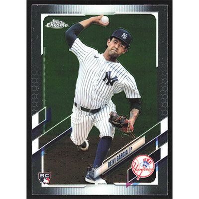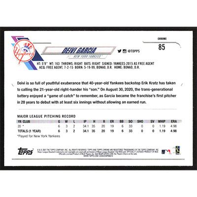 This is a 2021 Topps Chrome Deivi Garcia baseball card. The card is #85 and pictures show condition.