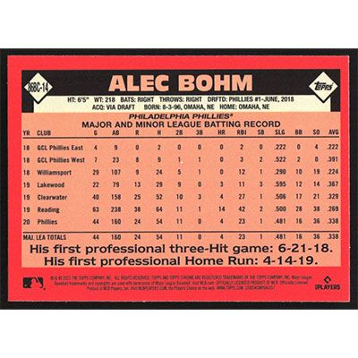 This is a 2021 Topps Chrome '86 Alec Bohm baseball card. The card is #86BC-14 and pictures show condition. Team(s): Philadelphia Phillies Rookie Card (RC)