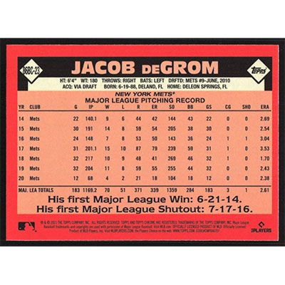 This is a 2021 Topps Chrome '86 Jacob deGrom baseball card. The card is #86BC-23 and pictures show condition.