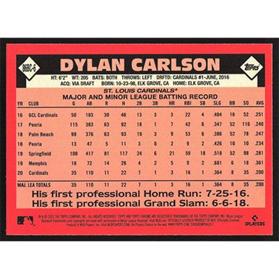 This is a 2021 Topps Chrome '86 Dylan Carlson baseball card. The card is #86BC-6 and pictures show condition. Team(s): St. Louis Cardinals Rookie Card (RC)