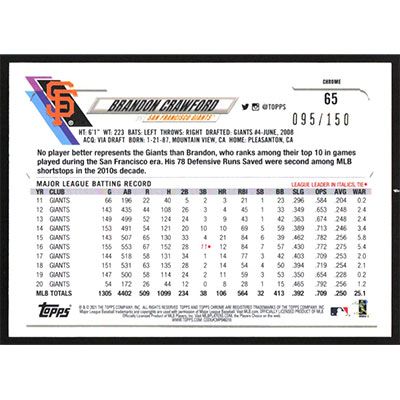 This is a 2021 Topps Chrome Blue Refractors Brandon Crawford baseball card. The card is #65 and pictures show condition. This card is limited; #'d 095/150.