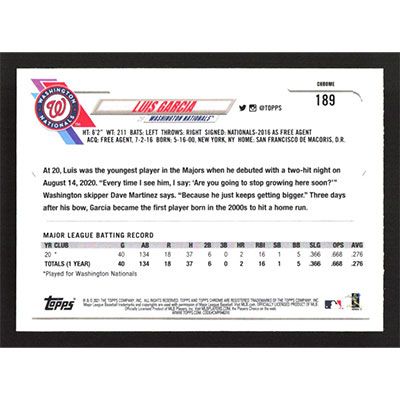 This is a 2021 Topps Chrome Pink Refractors Luis Garcia baseball card. The card is #189 and pictures show condition. Team(s): Washington Nationals Rookie Card (RC)