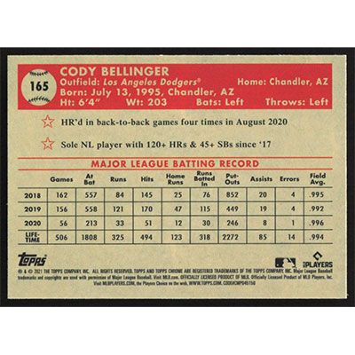 This is a 2021 Topps Chrome Platinum Anniversary Cody Bellinger baseball card. The card is #165 and pictures show condition. Team(s): Los Angeles Dodgers