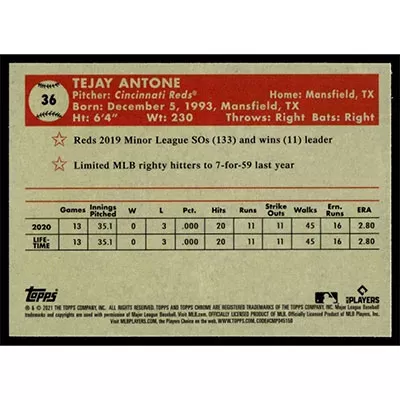 This is a 2021 Topps Chrome Platinum Anniversary Tejay Antone baseball card. The card is #36 and pictures show condition. Team(s): Cincinnati Reds Rookie Card (RC)