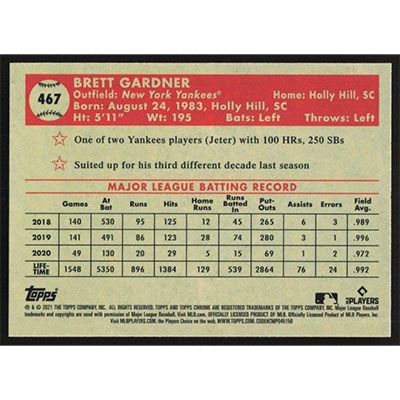 This is a 2021 Topps Chrome Platinum Anniversary Brett Gardner baseball card. The card is #467 and pictures show condition.
