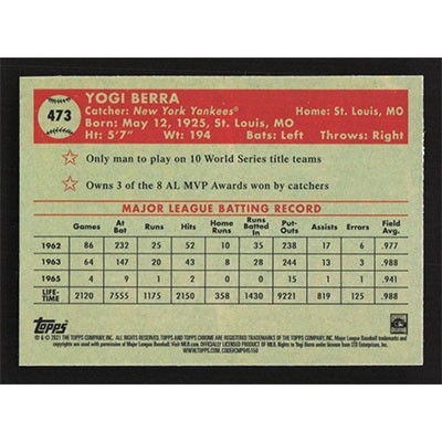 This is a 2021 Topps Chrome Platinum Anniversary Yogi Berra baseball card. The card is #473 and pictures show condition.