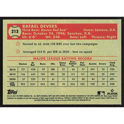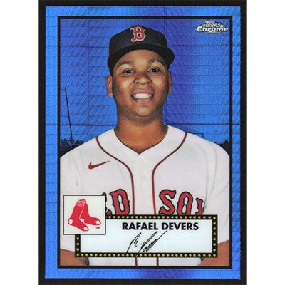 This is a 2021 Topps Chrome Platinum Anniversary Blue Prism Refractors Rafael Devers baseball card. The card is #213 and pictures show condition. Team(s): Boston Red Sox
