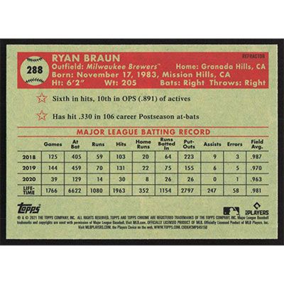 This is a 2021 Topps Chrome Platinum Anniversary Refractors Ryan Braun baseball card. The card is #288 and pictures show condition. Team(s): Milwaukee Brewers