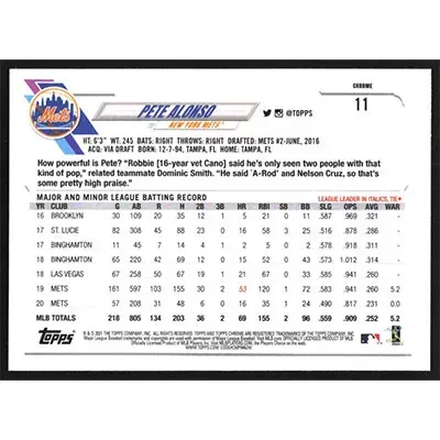 This is a 2021 Topps Chrome Prism Refractors Pete Alonso baseball card. The card is #11 and pictures show condition.