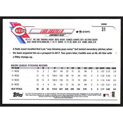 This is a 2021 Topps Chrome Prism Refractors Luis Castillo baseball card. The card is #31 and pictures show condition.
