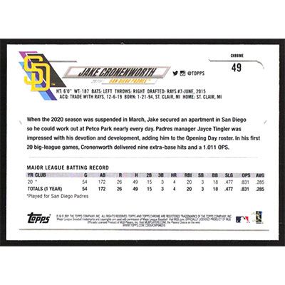This is a 2021 Topps Chrome Prism Refractors Jake Cronenworth baseball card. The card is #49 and pictures show condition. Team(s): San Diego Padres Rookie Card (RC)