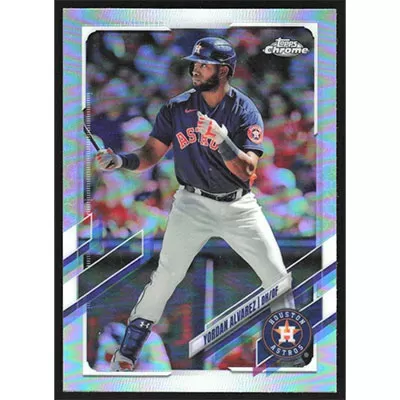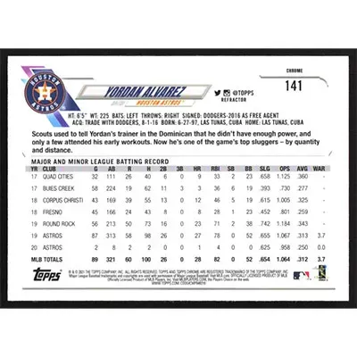 This is a 2021 Topps Chrome Refractors Yordan Alvarez baseball card. The card is #141 and pictures show condition.