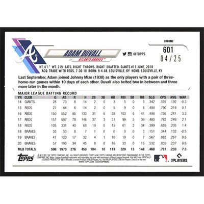 This is a 2021 Topps Chrome Sapphire Orange Refractors Adam Duvall baseball card. The card is #601 and pictures show condition. This card is limited; #'d 25-Apr.