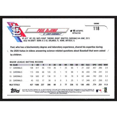 This is a 2021 Topps Chrome Sepia Refractors Paul DeJong baseball card. The card is #118 and pictures show condition.
