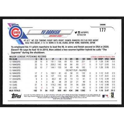 This is a 2021 Topps Chrome Sepia Refractors Yu Darvish baseball card. The card is #177 and pictures show condition.